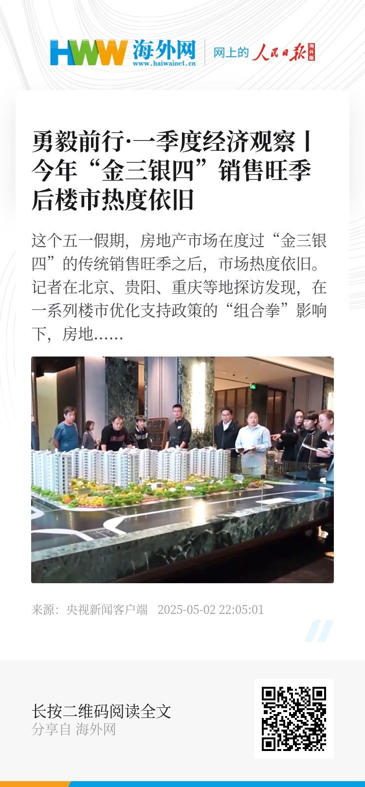 这个五一假期,房地产市场在度过“金三银四”的传统销售旺季之后,市场热度依旧。记者在北京、贵阳、重庆等地探访发现,在一系列楼市优化支持政策的“组合拳”影响下,房地产市场持续回暖,楼市“活跃度”不断提升。