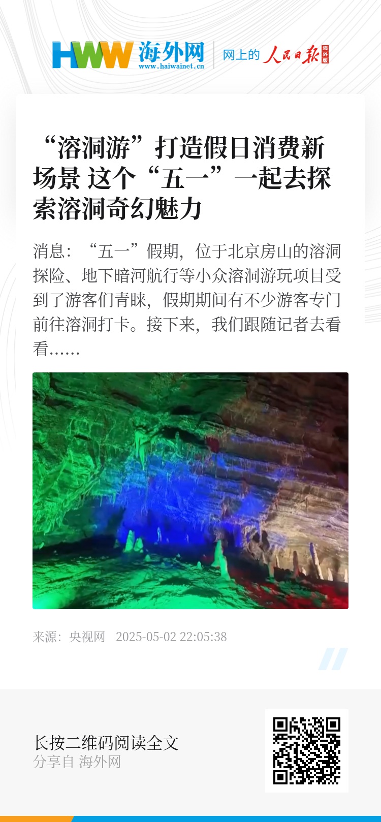 央视网消息:“五一”假期,位于北京房山的溶洞探险、地下暗河航行等小众溶洞游玩项目受到了游客们青睐,假期期间有不少游客专门前往溶洞打卡。接下来,我们跟随记者去看看溶洞里有什么奥秘。