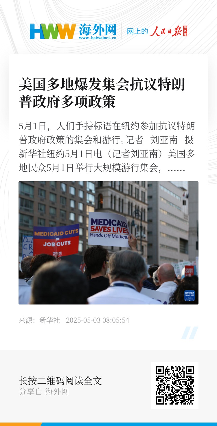 新华社纽约5月1日电(记者刘亚南)美国多地民众5月1日举行大规模游行集会,抗议特朗普政府在经济、移民、教育、税收等多方面的政策。
