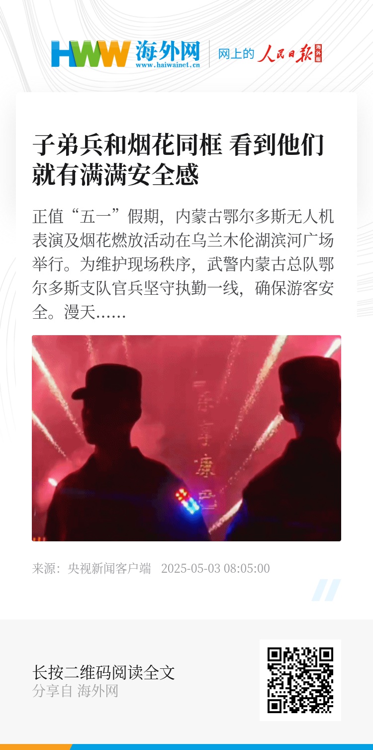 正值“五一”假期,内蒙古鄂尔多斯无人机表演及烟花燃放活动在乌兰木伦湖滨河广场举行。为维护现场秩序,武警内蒙古总队鄂尔多斯支队官兵坚守执勤一线,确保游客安全。