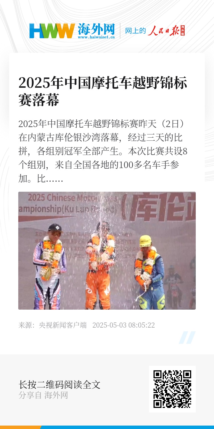 2025年中国摩托车越野锦标赛昨天(2日)在内蒙古库伦银沙湾落幕,经过三天的比拼,各组别冠军全部产生。
