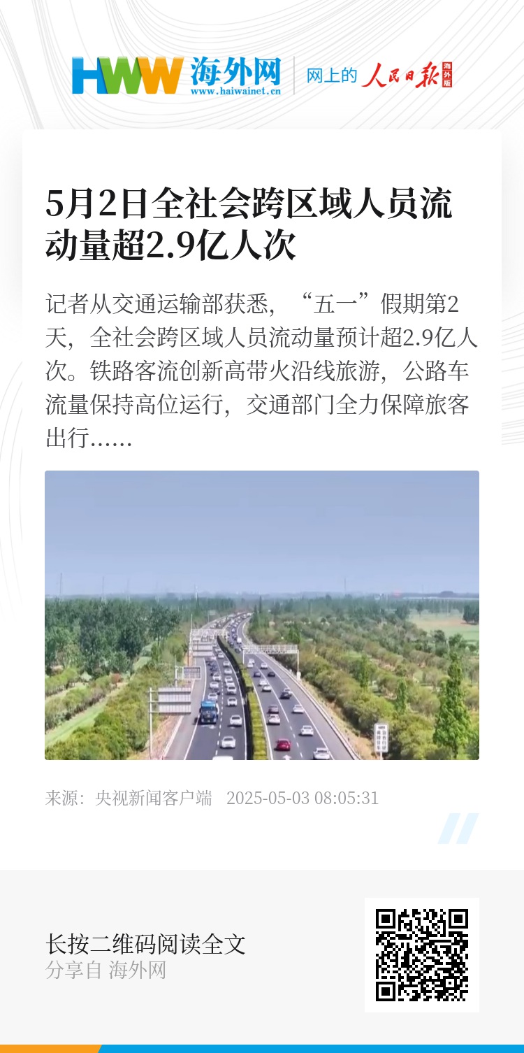 5月2日,全社会跨区域人员流动量约2.9亿人次,同比增长3%。其中,铁路客流在5月1日创出单日新高后,继续保持在1900万人次以上,中短途客流占比增加。广深港高铁跨境旅客同比增长超10%,京津城际单日旅客发送量超过18万人次,增开6组重联和高峰图列车。