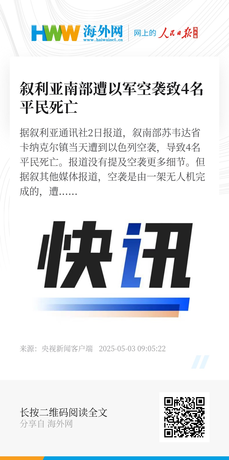 据叙利亚通讯社2日报道,叙南部苏韦达省卡纳克尔镇当天遭到以色列空袭,导致4名平民死亡。