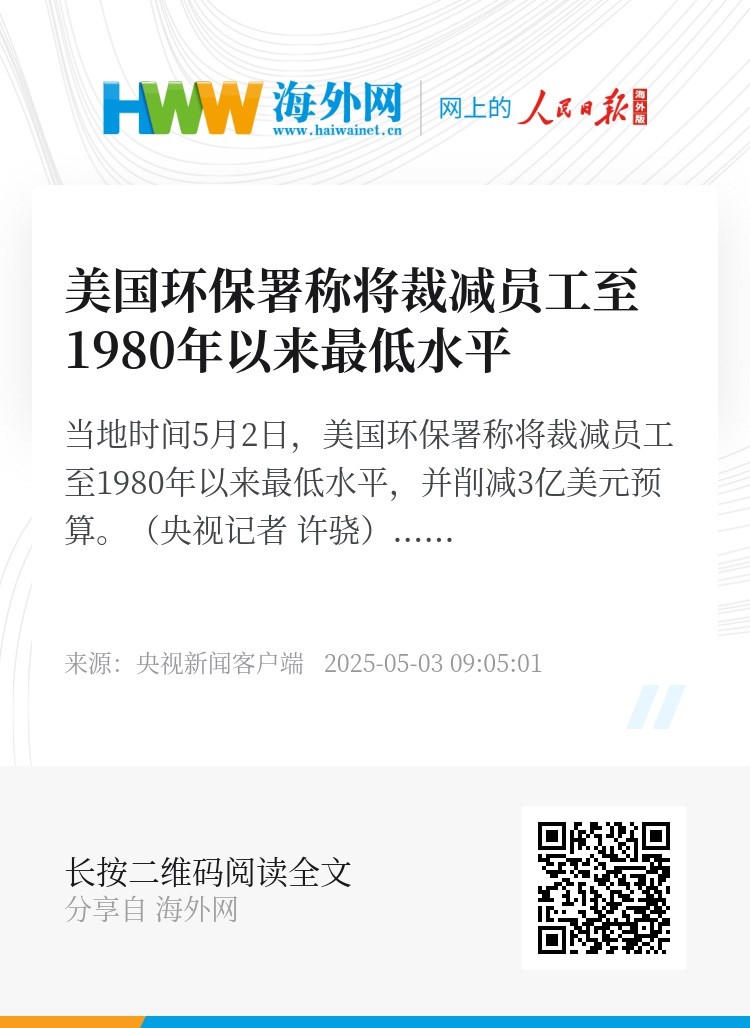 当地时间5月2日,美国环保署称将裁减员工至1980年以来最低水平,并削减3亿美元预算。(央视记者 许骁)