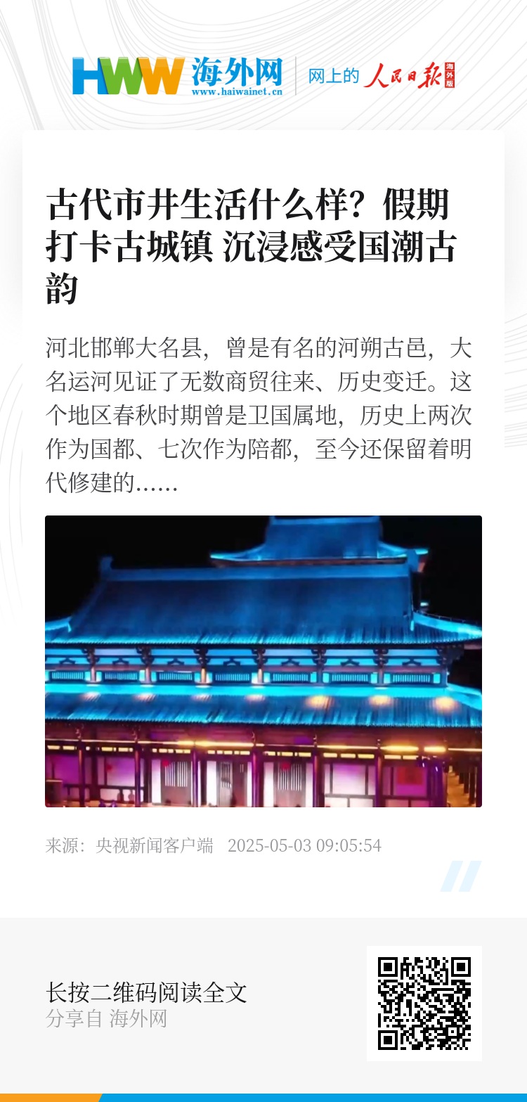 河北邯郸大名县,曾是有名的河朔古邑,大名运河见证了无数商贸往来、历史变迁。这个地区春秋时期曾是卫国属地,历史上两次作为国都、七次作为陪都,至今还保留着明代修建的古城墙。五一期间,古城推出多项文旅活动,让游客可以沉浸式感受繁华时期“北宋大名府”的市井烟火。
