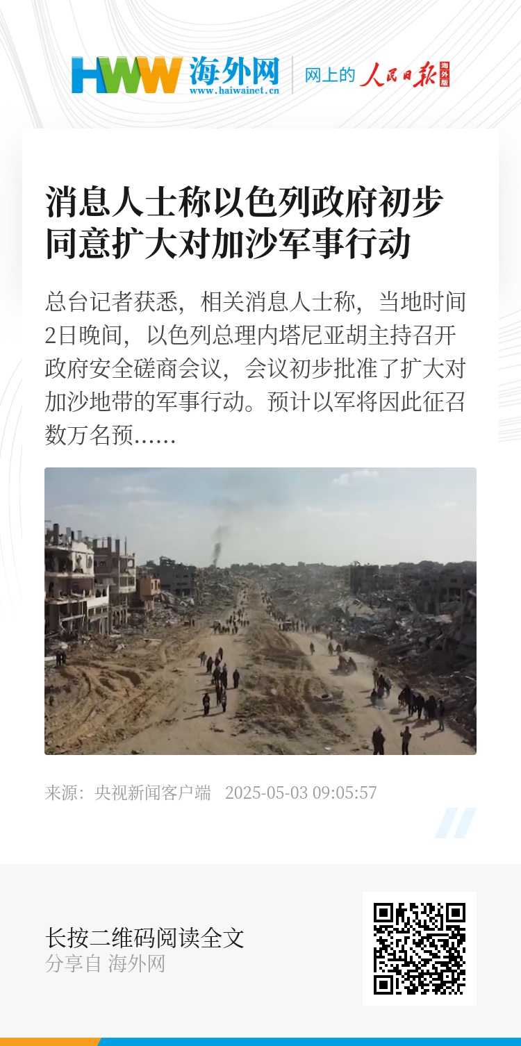 总台记者获悉,相关消息人士称,当地时间2日晚间,以色列总理内塔尼亚胡主持召开政府安全磋商会议,会议初步批准了扩大对加沙地带的军事行动。预计以军将因此征召数万名预备役人员。不过消息同时称,预计以色列将有限扩大其军事行动,而不以占领加沙大片地区为目的。