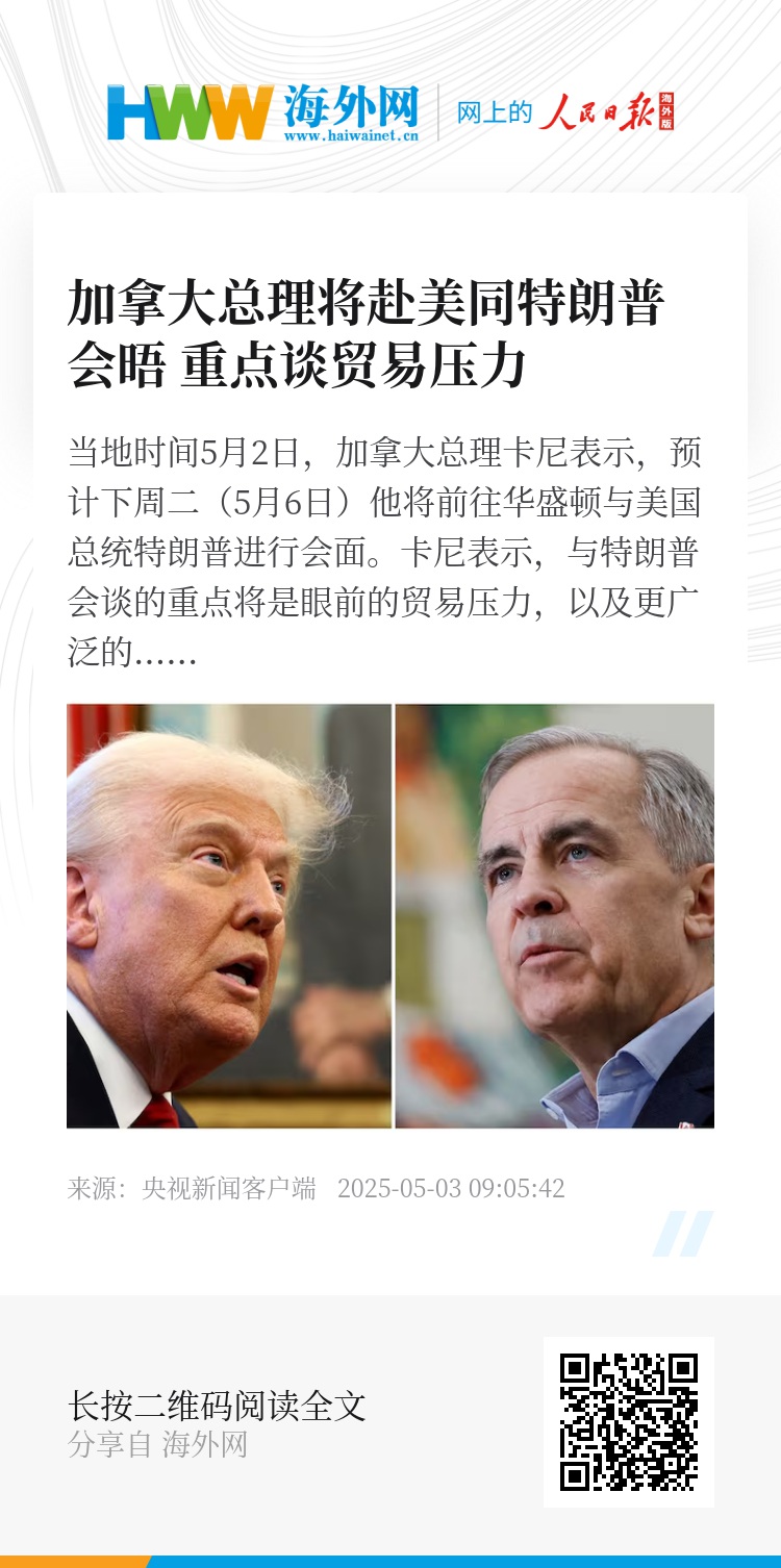 当地时间5月2日,加拿大总理卡尼表示,预计下周二(5月6日)他将前往华盛顿与美国总统特朗普进行会面。