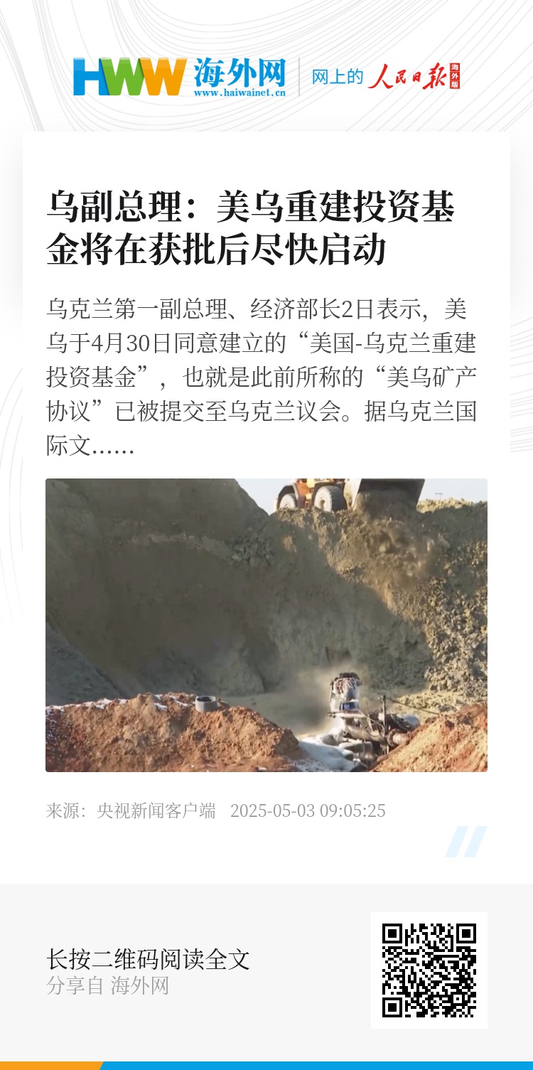 乌克兰第一副总理、经济部长2日表示,美乌于4月30日同意建立的“美国-乌克兰重建投资基金”,也就是此前所称的“美乌矿产协议”已被提交至乌克兰议会。