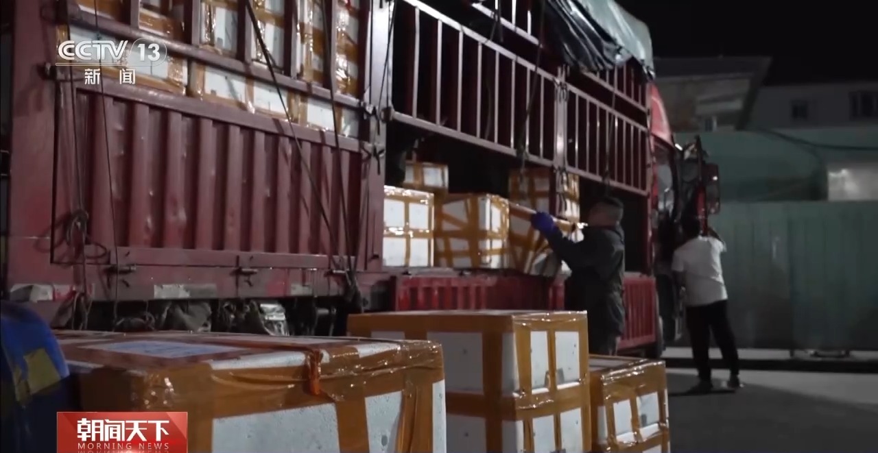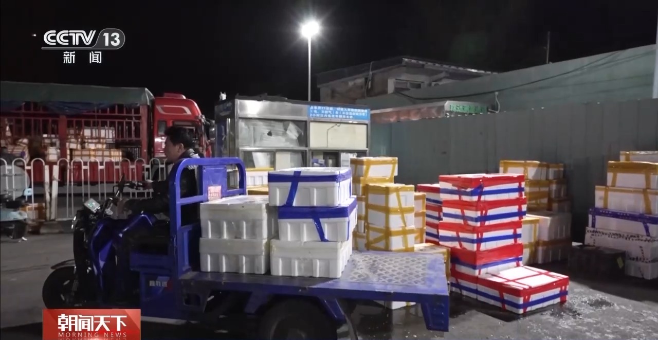 总台央视记者 张琪:在北京大红门京深海鲜批发市场,凌晨2点半,进场的车辆络绎不绝,物流停车场也停满了正在卸货的货车。