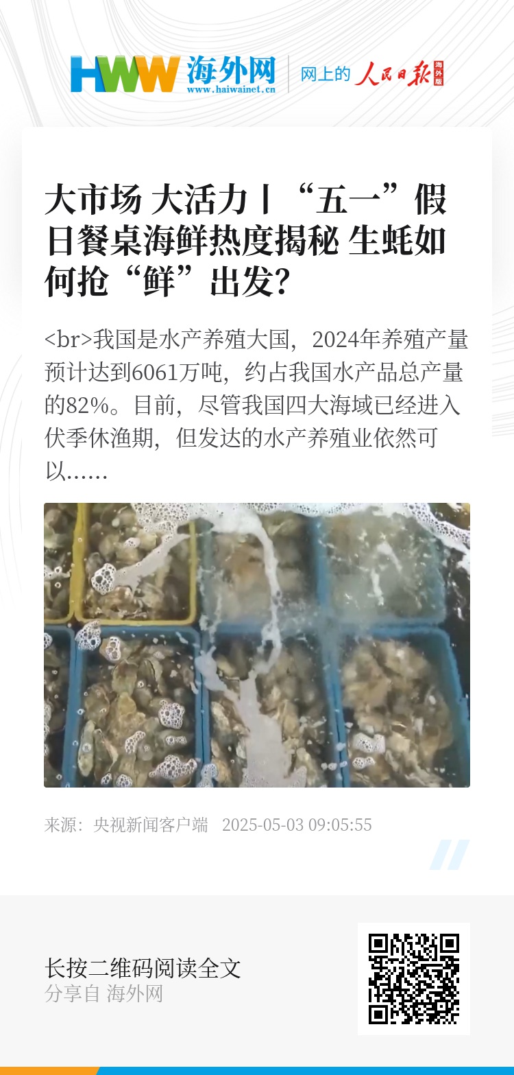 总台央视记者 李啸虎:在国家农业产业强镇广东阳西程村镇,“五一”期间,这里的生蚝迎来大量上市。这片占地六万多亩的生蚝养殖基地里,养殖户正从水下收获一排排成熟的生蚝,40多万箱新捕捞的海鲜正从这里走上百姓的节日餐桌。