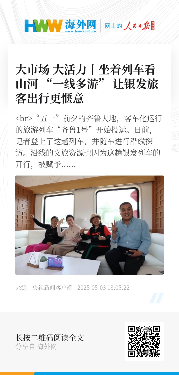 中国旅行社协会铁道旅游分会秘书长 曾辉:通过当地农特产品上车展销、非遗文化和表演上车以及电影等主题车厢,构建移动的展销和文化体验空间,为旅客带来新的消费体验。银发旅游列车通过拉动当地住宿、餐饮、演出、商贸、导游服务、文化产品销售等,提振消费、激活经济。