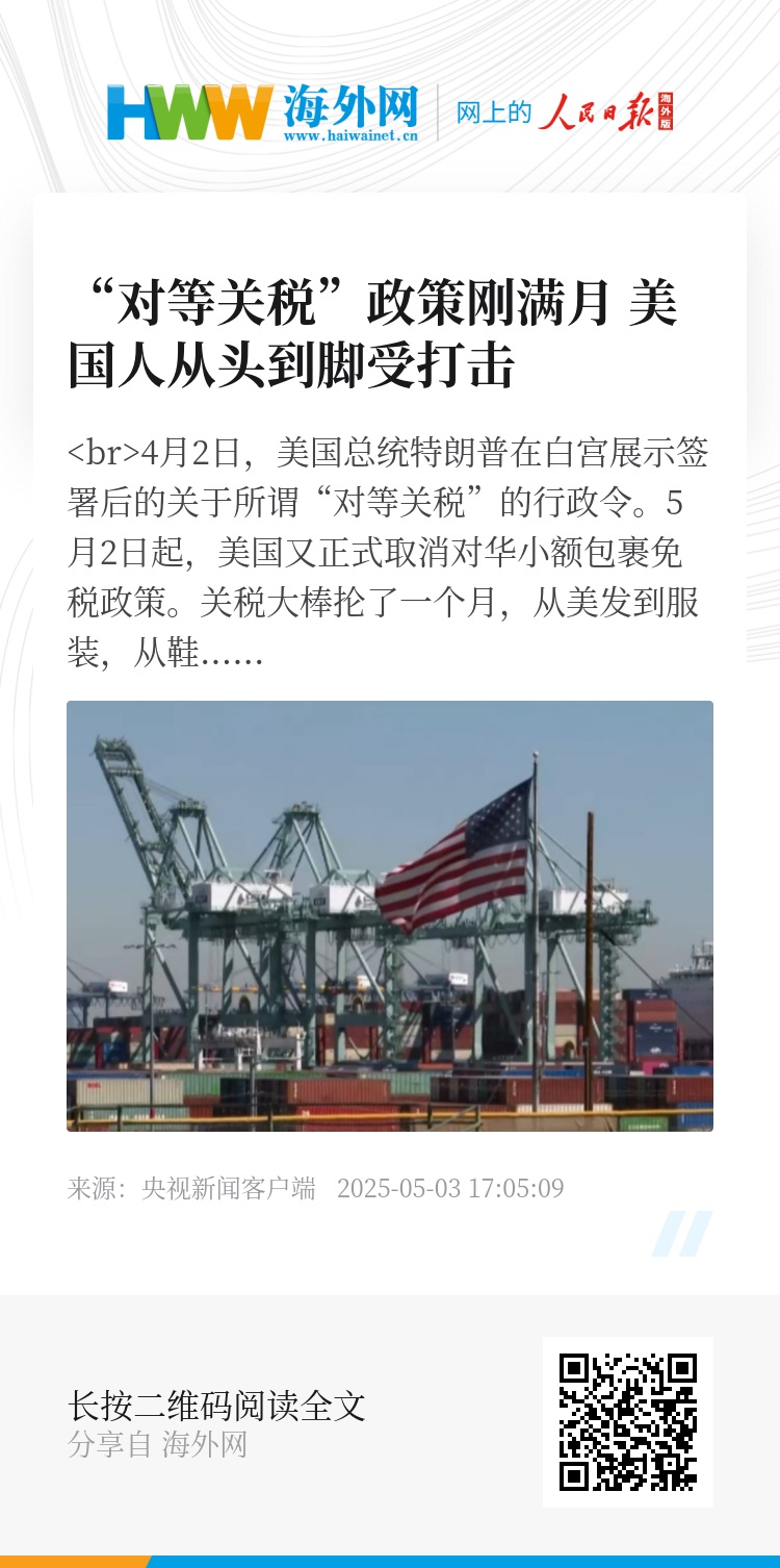 4月2日,美国总统特朗普在白宫展示签署后的关于所谓“对等关税”的行政令。5月2日起,美国又正式取消对华小额包裹免税政策。关税大棒抡了一个月,从美发到服装,从鞋子到药品,美国民众日常生活各个方面遭受无差别打击。