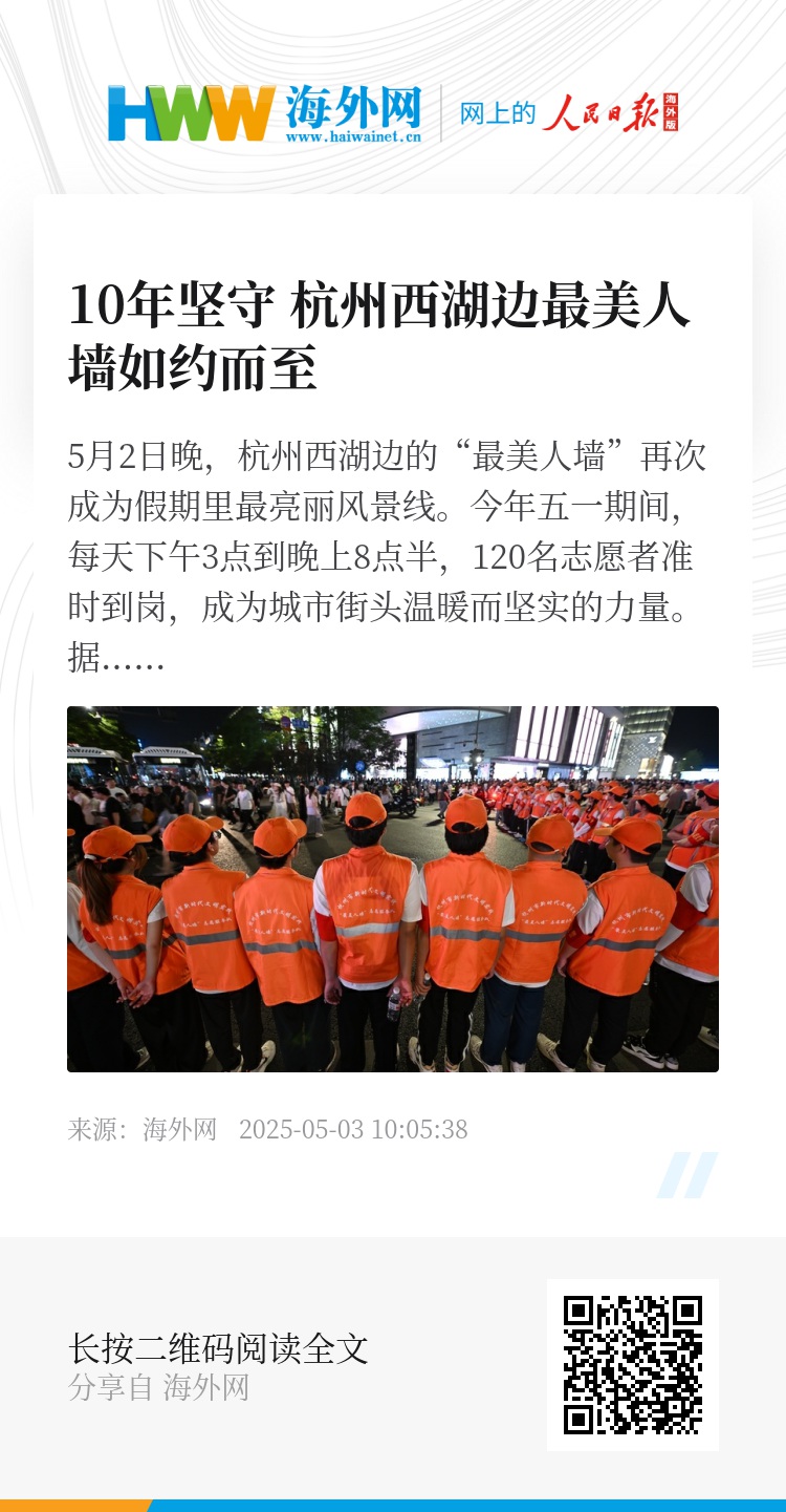 5月2日晚,杭州西湖边的“最美人墙”再次成为假期里最亮丽风景线。今年五一期间,每天下午3点到晚上8点半,120名志愿者准时到岗,成为城市街头温暖而坚实的力量。据悉,杭州西湖边的“最美人墙”志愿服务项目自2015年创立以来,已连续10年在重要节假日期间守护游客安全。图源:东方IC
