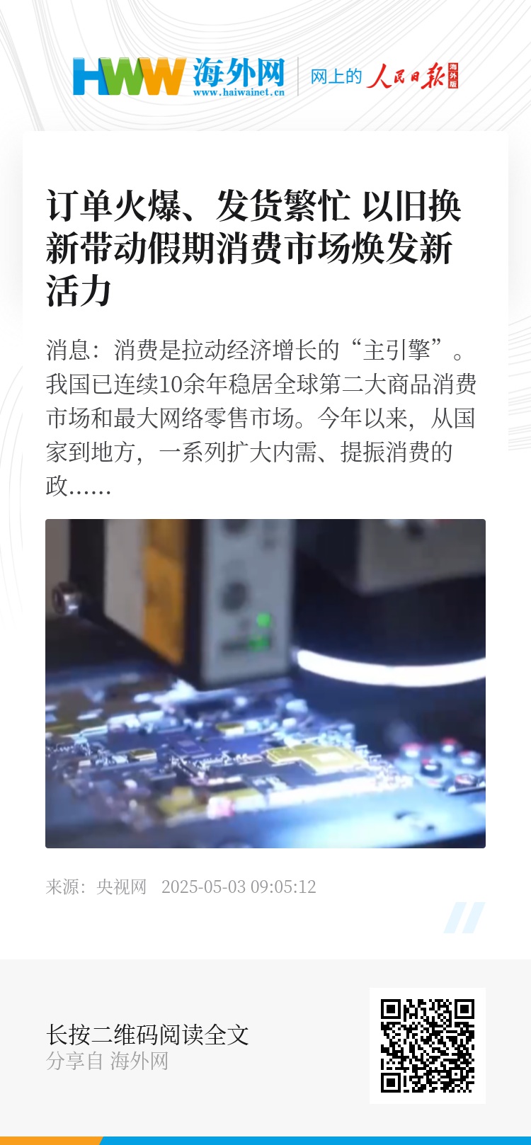 央视网消息:消费是拉动经济增长的“主引擎”。我国已连续10余年稳居全球第二大商品消费市场和最大网络零售市场。今年以来,从国家到地方,一系列扩大内需、提振消费的政策接连出台,让我国这个超大规模消费市场活力不断激发,内需潜力持续释放。手机、笔记本电脑等数码产品今年被纳入以旧换新补贴范围后,销量大增。数据显示,截至4月27日,消费者新购买手机等数码产品超3700万件。