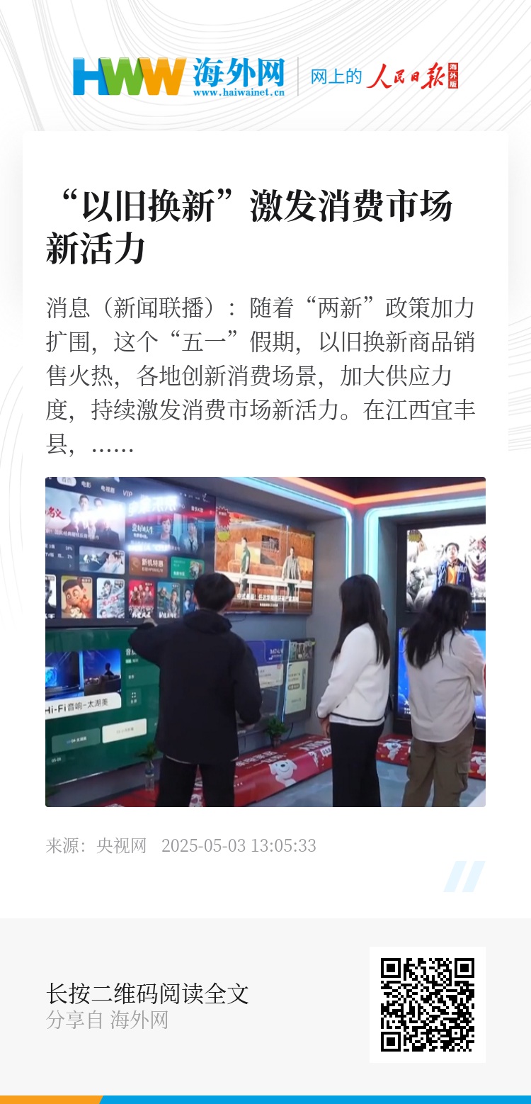 央视网消息(新闻联播):随着“两新”政策加力扩围,这个“五一”假期,以旧换新商品销售火热,各地创新消费场景,加大供应力度,持续激发消费市场新活力。