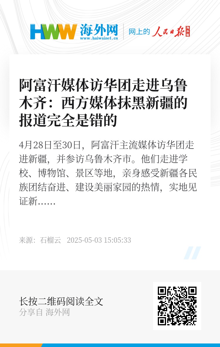 4月28日至30日,阿富汗主流媒体访华团走进新疆,并参访乌鲁木齐市。他们走进学校、博物馆、景区等地,亲身感受新疆各民族团结奋进、建设美丽家园的热情,实地见证新疆现代化建设取得的显著成果。