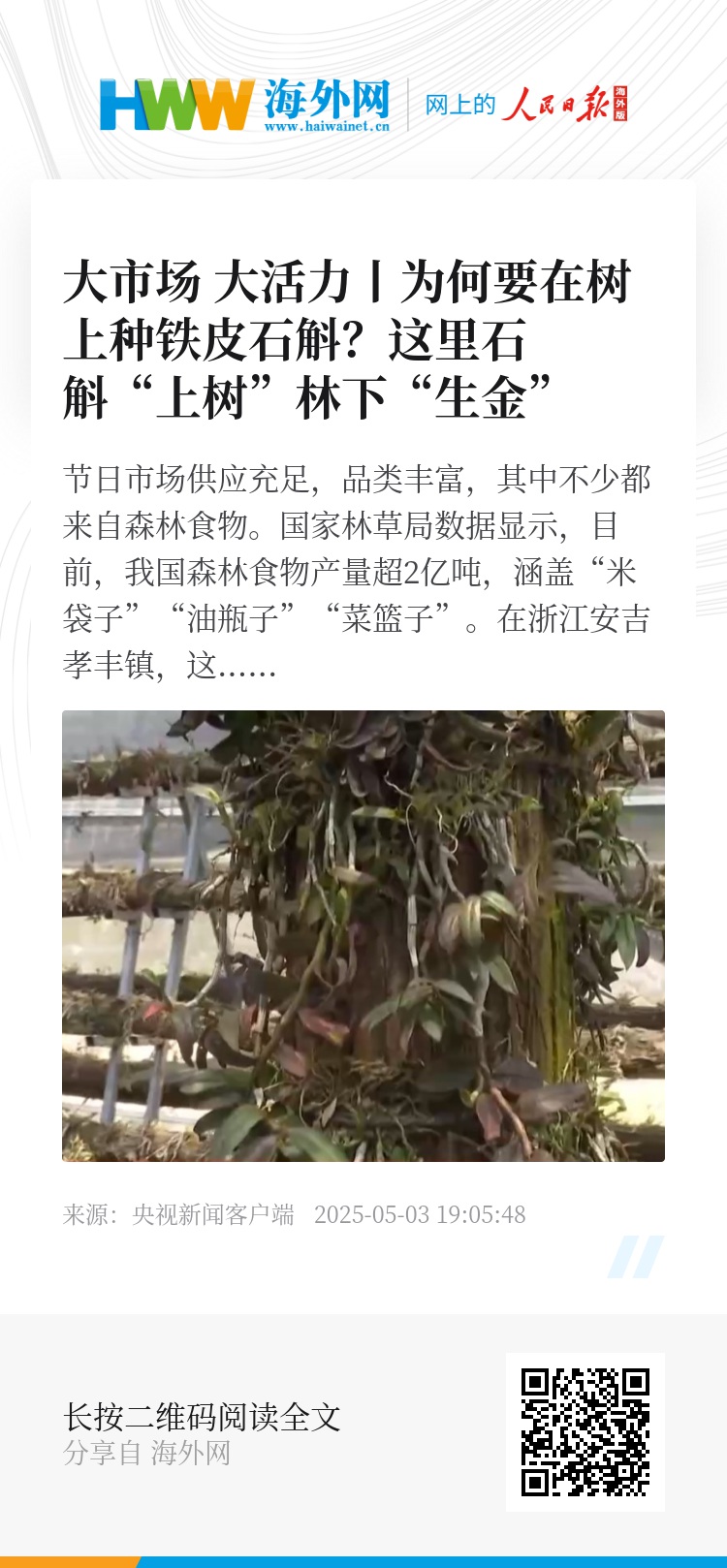 节日市场供应充足,品类丰富,其中不少都来自森林食物。国家林草局数据显示,目前,我国森林食物产量超2亿吨,涵盖“米袋子”“油瓶子”“菜篮子”。在浙江安吉孝丰镇,这个“五一”假期,这里的铁皮石斛迎来采摘季。