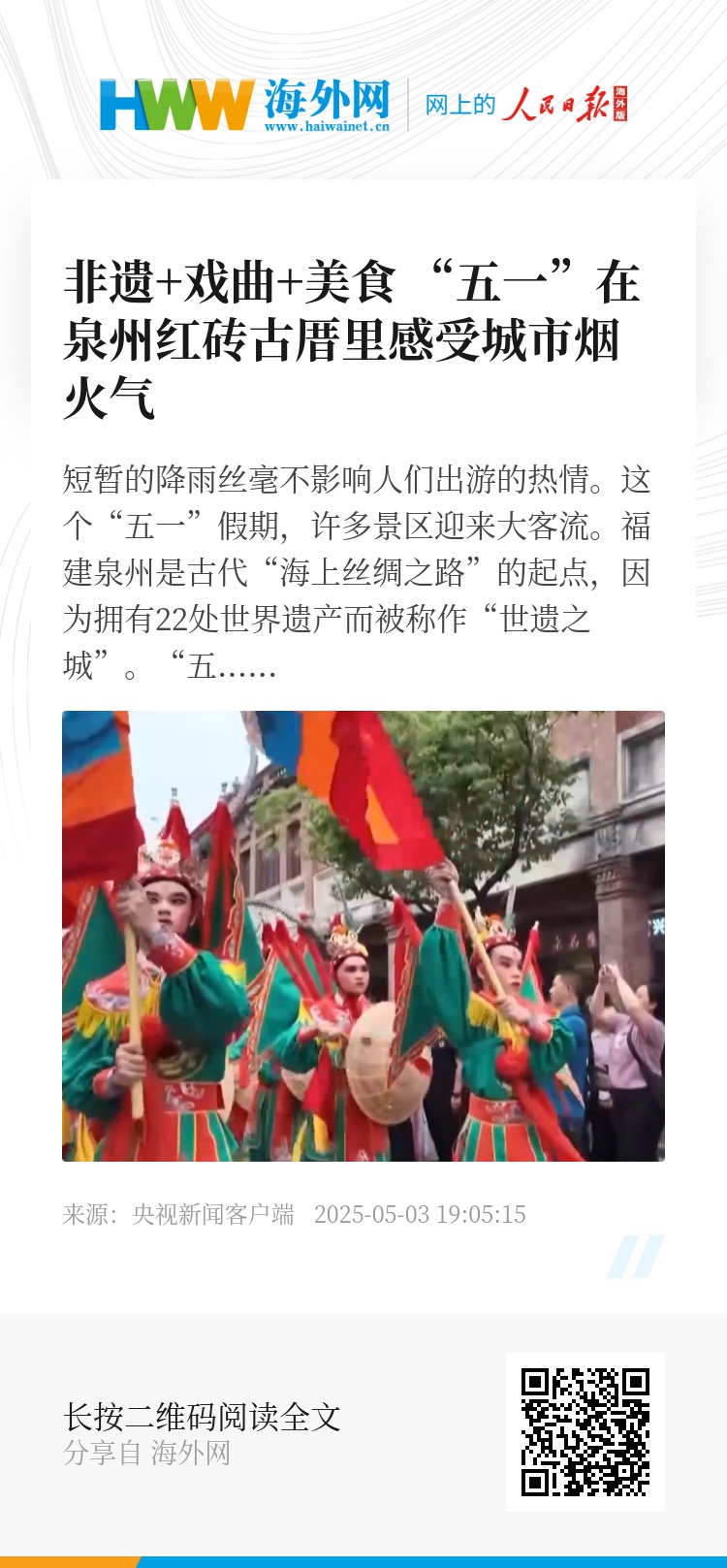 总台记者 吴燕敏:我在泉州古城的梨园广场,现场不仅有戏,还有美食、簪花、非遗、文创等等。这个假期,泉州的旅游文化体验非常丰富。