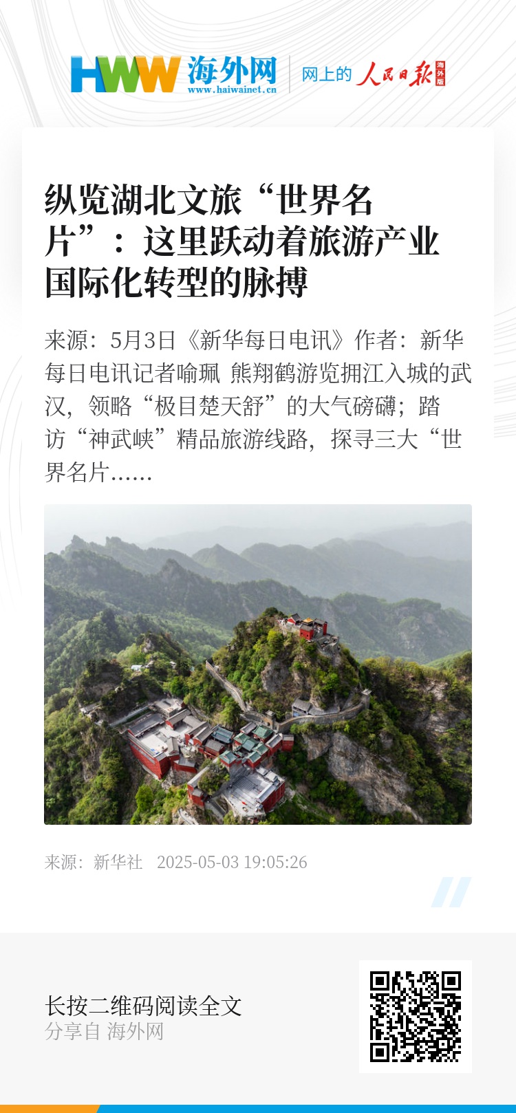游览拥江入城的武汉,领略“极目楚天舒”的大气磅礴;踏访“神武峡”精品旅游线路,探寻三大“世界名片”之奇观……这里是坐拥山水长卷、人文史诗的荆楚胜景,更是我国建设“旅游强国”的前沿阵地。连日来,湖北正式宣介“神武峡”“赤黄红”两大文旅主轴,提出重点打造大黄鹤楼、武当山、长江三峡、神农架、恩施大峡谷5家世界知名旅游景区,分重点、分时序、梯度推进建设世界知名文化旅游目的地。