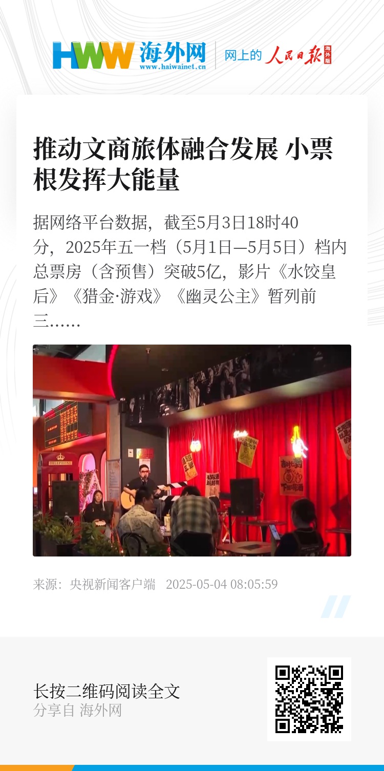 今年“五一”假期,电影院里十余部新片轮番上映,同时,各地还推出了形式多样的“电影+文旅”“电影+美食”促消费活动,通过电影票或景区门票的票根,来带动提升综合消费动能。