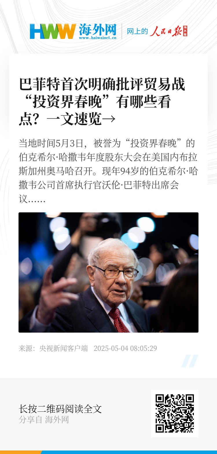 当地时间5月3日,被誉为“投资界春晚”的伯克希尔·哈撒韦年度股东大会在美国内布拉斯加州奥马哈召开。现年94岁的伯克希尔·哈撒韦公司首席执行官沃伦·巴菲特出席会议。当天,在回答关于美国总统特朗普的关税政策等问题时,巴菲特指出,美国不应该“将贸易当作武器”;美国媒体认为,巴菲特此番表态是他迄今为止对美国政府关税政策最直接的批评。此外,他还宣布计划在年底退休,引发关注。