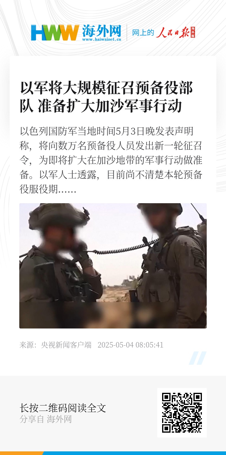 以色列国防军当地时间5月3日晚发表声明称,将向数万名预备役人员发出新一轮征召令,为即将扩大在加沙地带的军事行动做准备。