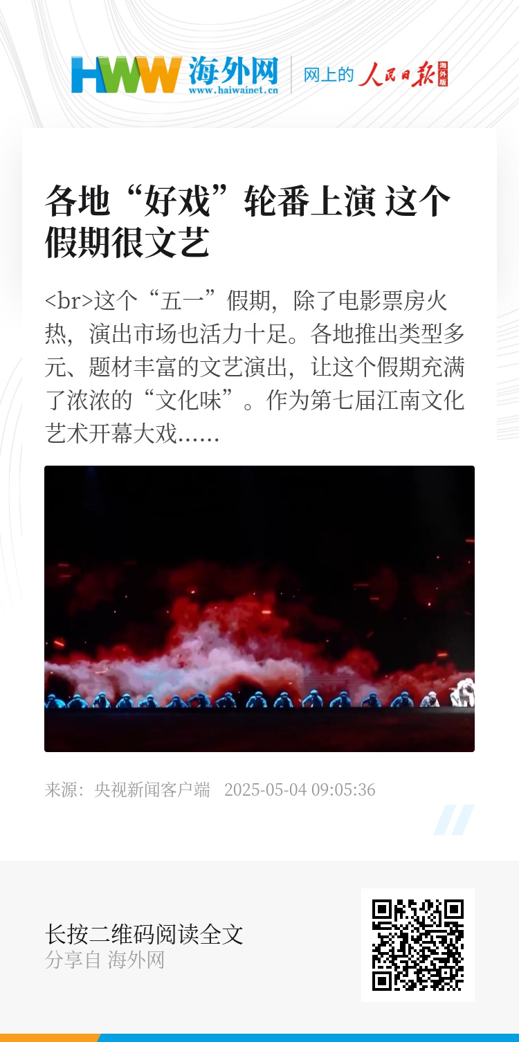 这个“五一”假期,除了电影票房火热,演出市场也活力十足。各地推出类型多元、题材丰富的文艺演出,让这个假期充满了浓浓的“文化味”。