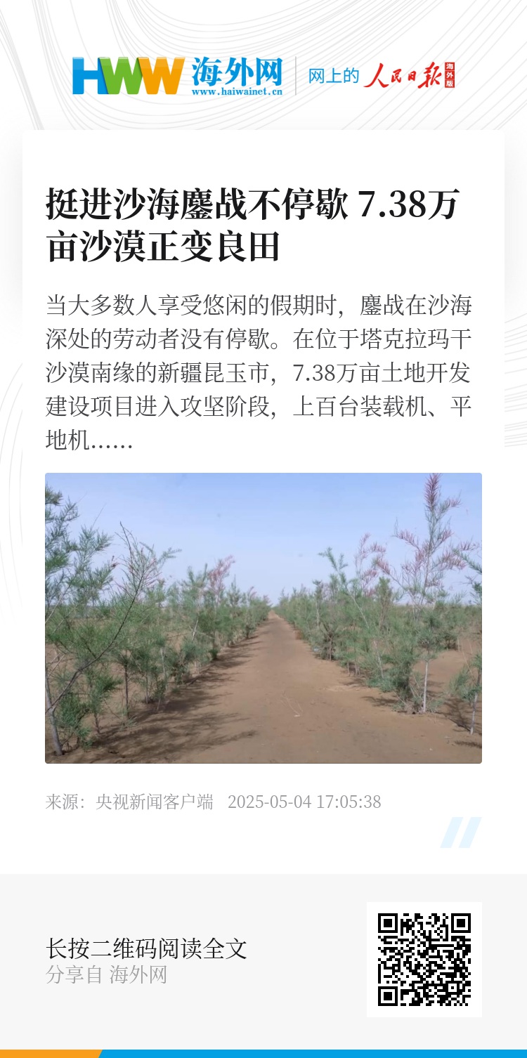 当大多数人享受悠闲的假期时,鏖战在沙海深处的劳动者没有停歇。在位于塔克拉玛干沙漠南缘的新疆昆玉市,7.38万亩土地开发建设项目进入攻坚阶段,上百台装载机、平地机来回穿梭进行平沙作业。