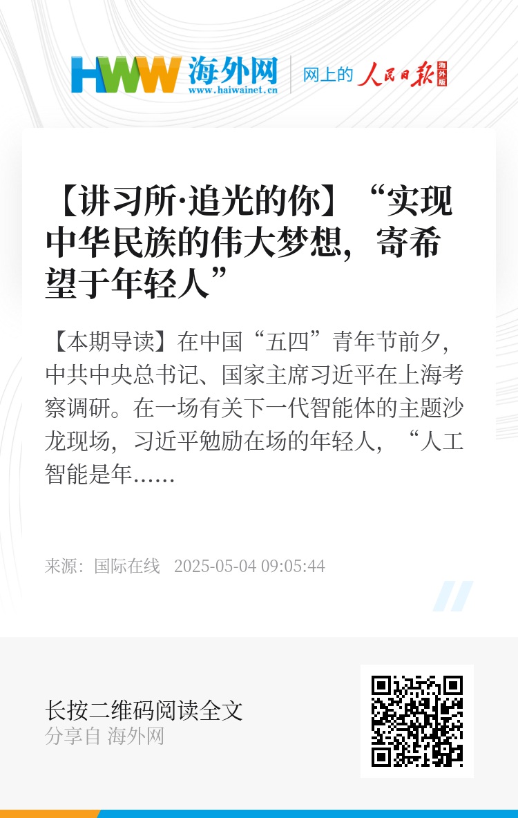 在中国“五四”青年节前夕,中共中央总书记、国家主席习近平在上海考察调研。在一场有关下一代智能体的主题沙龙现场,习近平勉励在场的年轻人,“人工智能是年轻的事业,也是年轻人的事业”“我们正在全面推进强国建设、民族复兴伟业,正是年轻一代展示才华、大显身手的好时候。实现中华民族的伟大梦想,寄希望于年轻人。”