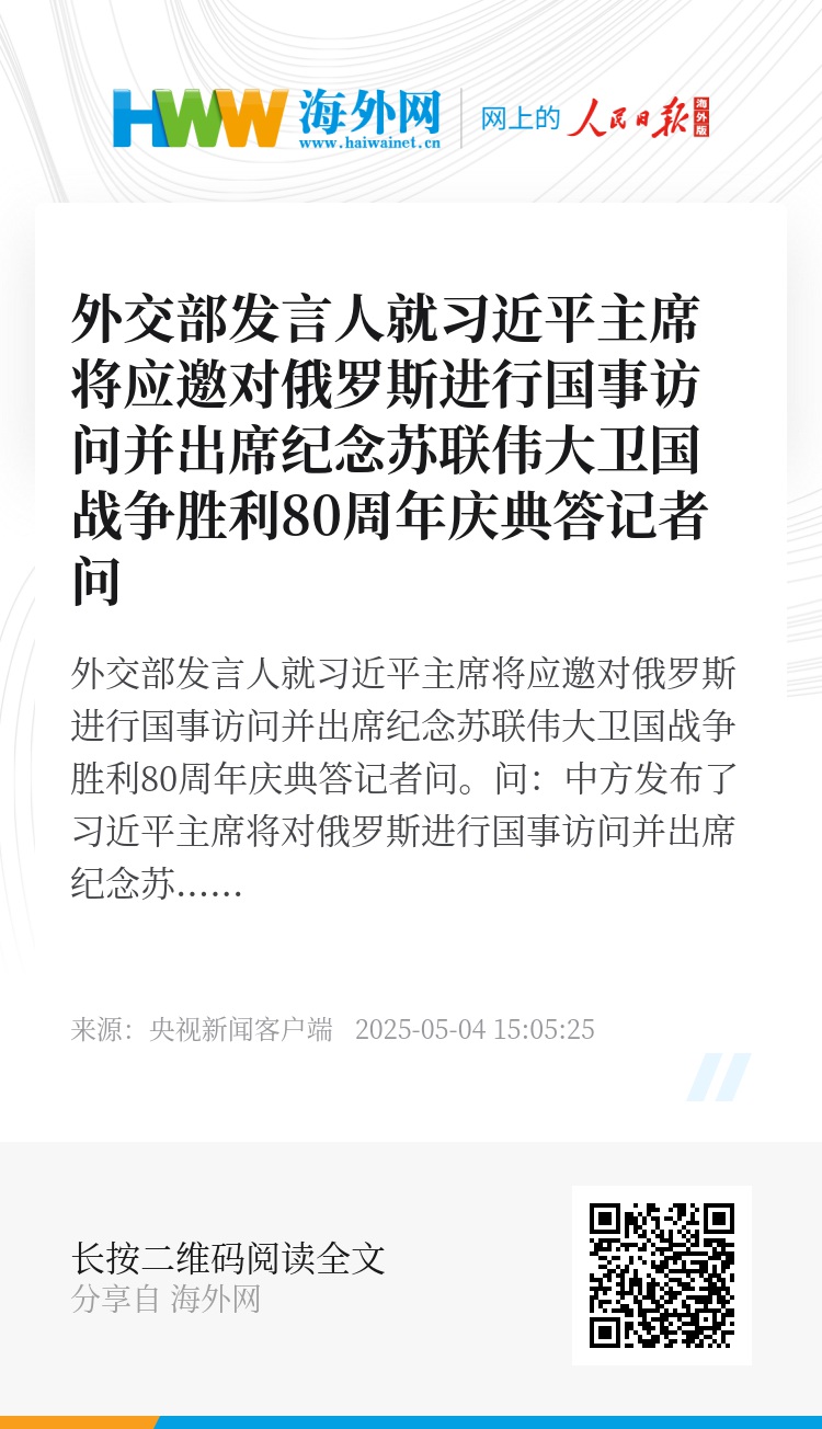 外交部发言人就习近平主席将应邀对俄罗斯进行国事访问并出席纪念苏联伟大卫国战争胜利80周年庆典答记者问。
