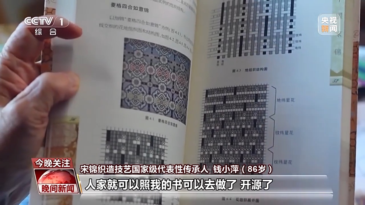 宋锦织造技艺国家级代表性传承人 钱小萍:我把我这个知识很正确地记录在我的书上《中国宋锦》,那么就可以传播了,人家就可以照我的书去做了,开源了。在电脑织机上一做,全国遍地开花。