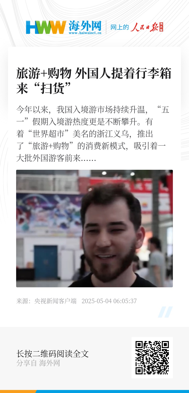 今年以来,我国入境游市场持续升温,“五一”假期入境游热度更是不断攀升。有着“世界超市”美名的浙江义乌,推出了“旅游+购物”的消费新模式,吸引着一大批外国游客前来“中国购”。