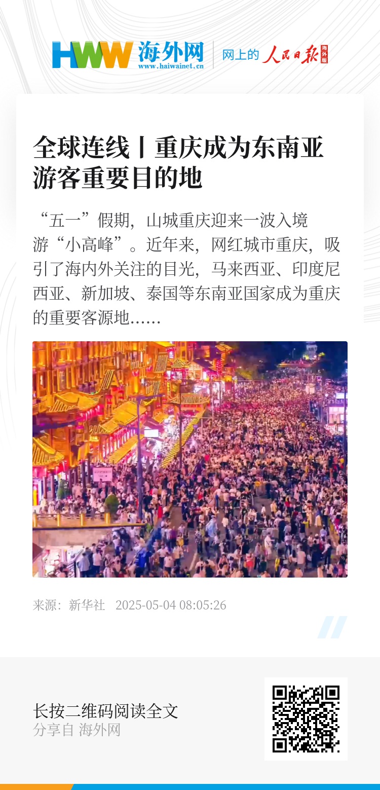 “五一”假期,山城重庆迎来一波入境游“小高峰”。近年来,网红城市重庆,吸引了海内外关注的目光,马来西亚、印度尼西亚、新加坡、泰国等东南亚国家成为重庆的重要客源地。