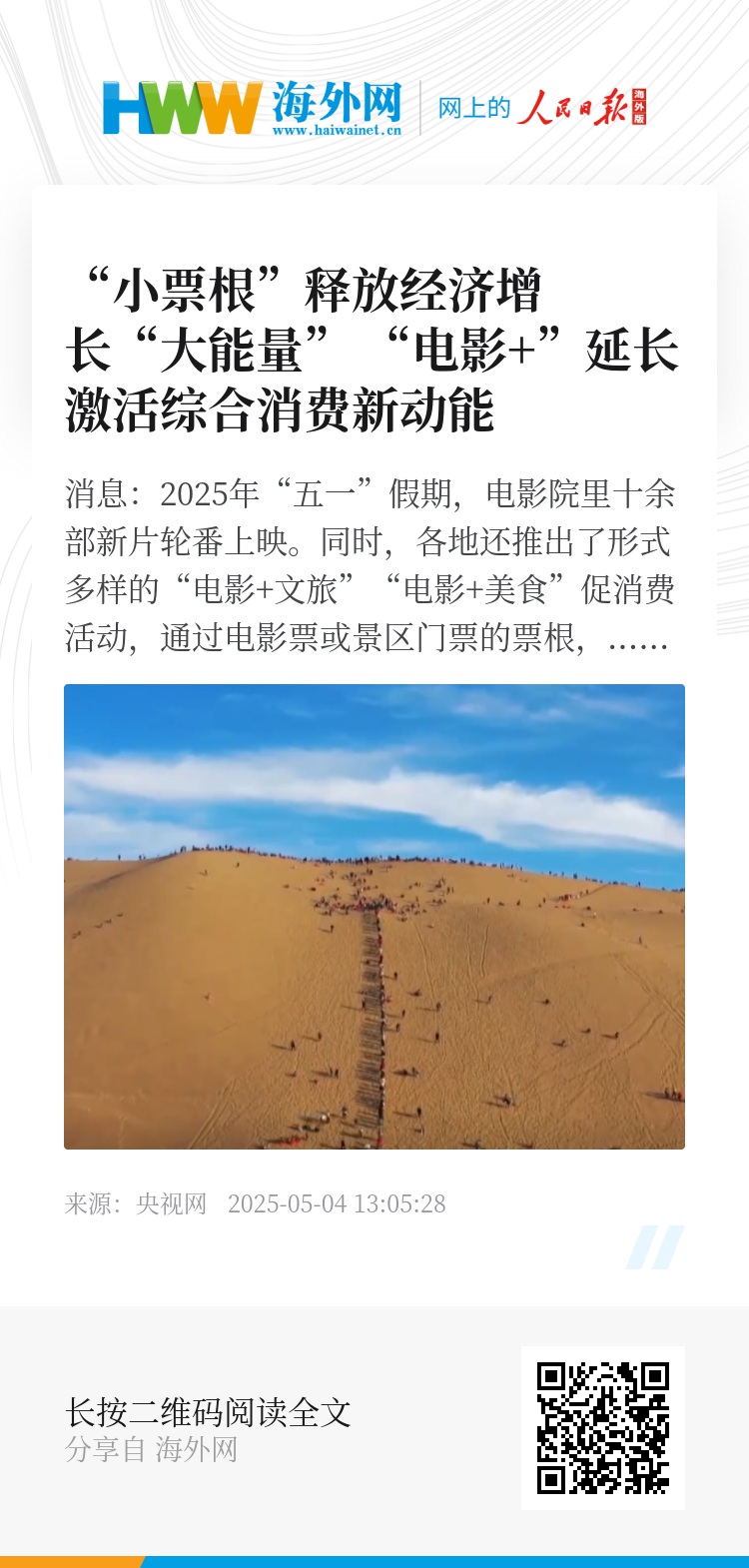 央视网消息:2025年“五一”假期,电影院里十余部新片轮番上映。同时,各地还推出了形式多样的“电影+文旅”“电影+美食”促消费活动,通过电影票或景区门票的票根,来带动提升综合消费动能。