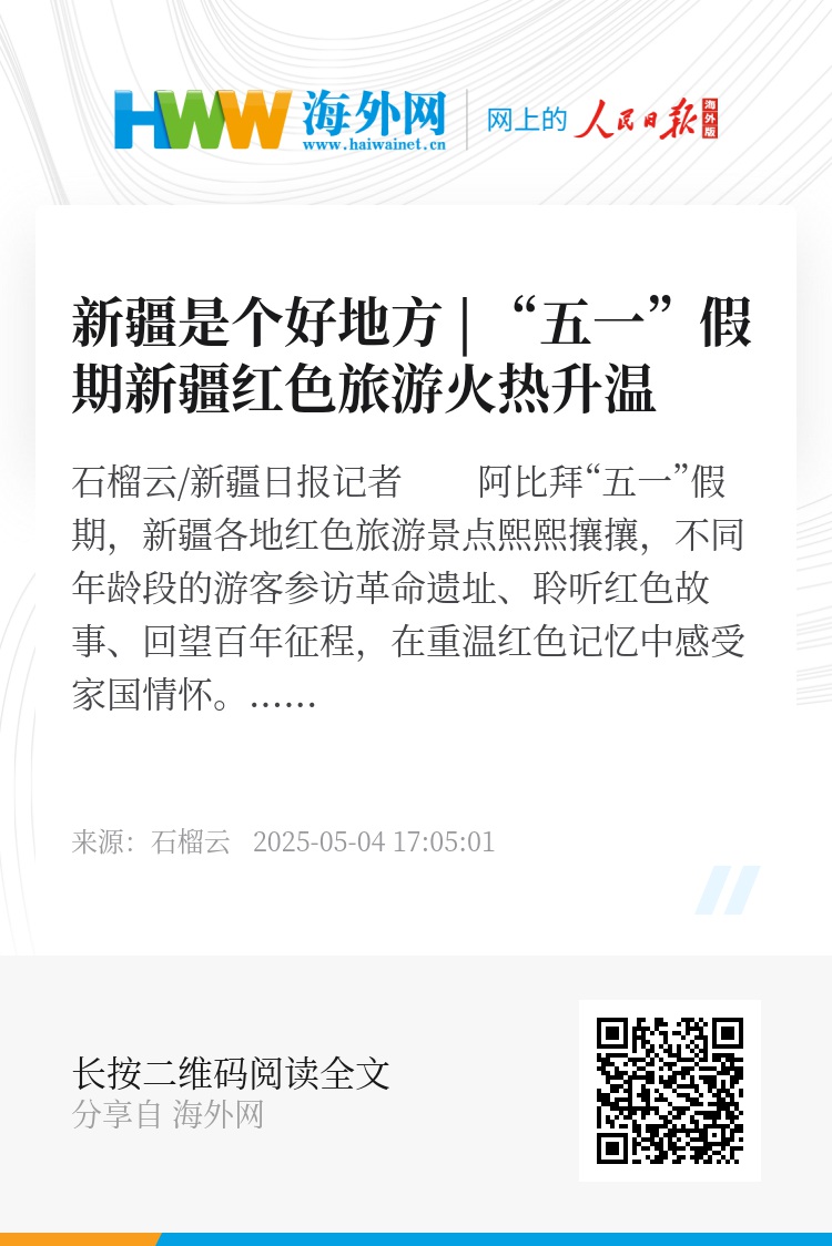 “五一”假期,新疆各地红色旅游景点熙熙攘攘,不同年龄段的游客参访革命遗址、聆听红色故事、回望百年征程,在重温红色记忆中感受家国情怀。