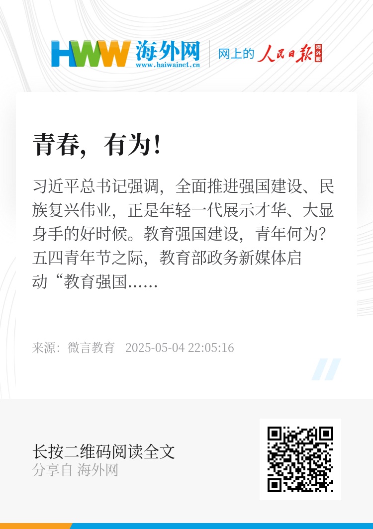 习近平总书记强调,全面推进强国建设、民族复兴伟业,正是年轻一代展示才华、大显身手的好时候。教育强国建设,青年何为?五四青年节之际,教育部政务新媒体启动“教育强国,有我!”网络主题宣传活动,推出“青年说(奋进篇)”系列,展现青年师生以青春之我、奋斗之我投身教育强国建设的生动实践。今天,跟教育小微通过1个微视频和1组海报,共同感受北京大学青年师生走向五湖四海的青春担当——