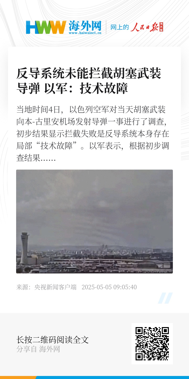 当地时间4日,以色列空军对当天胡塞武装向本-古里安机场发射导弹一事进行了调查,初步结果显示拦截失败是反导系统本身存在局部“技术故障”。