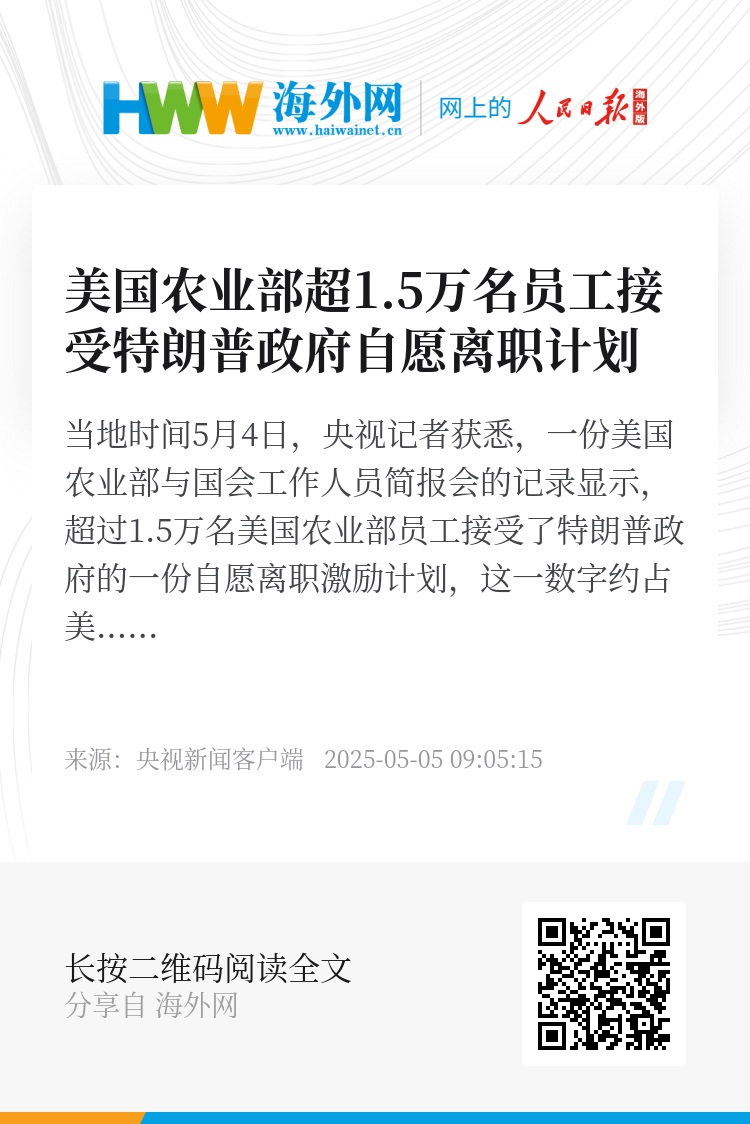 当地时间5月4日,央视记者获悉,一份美国农业部与国会工作人员简报会的记录显示,超过1.5万名美国农业部员工接受了特朗普政府的一份自愿离职激励计划,这一数字约占美国农业部总劳动力的15%。此前,为缩减联邦劳动力规模,特朗普政府已向选择离职的联邦雇员提供数月的工资和福利。