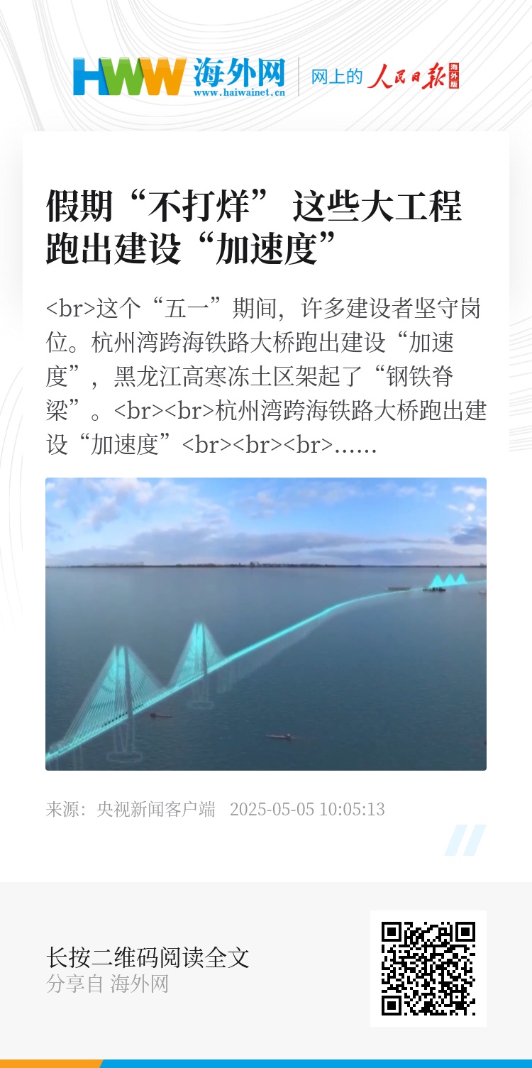 这个“五一”期间,许多建设者坚守岗位。杭州湾跨海铁路大桥跑出建设“加速度”,黑龙江高寒冻土区架起了“钢铁脊梁”。