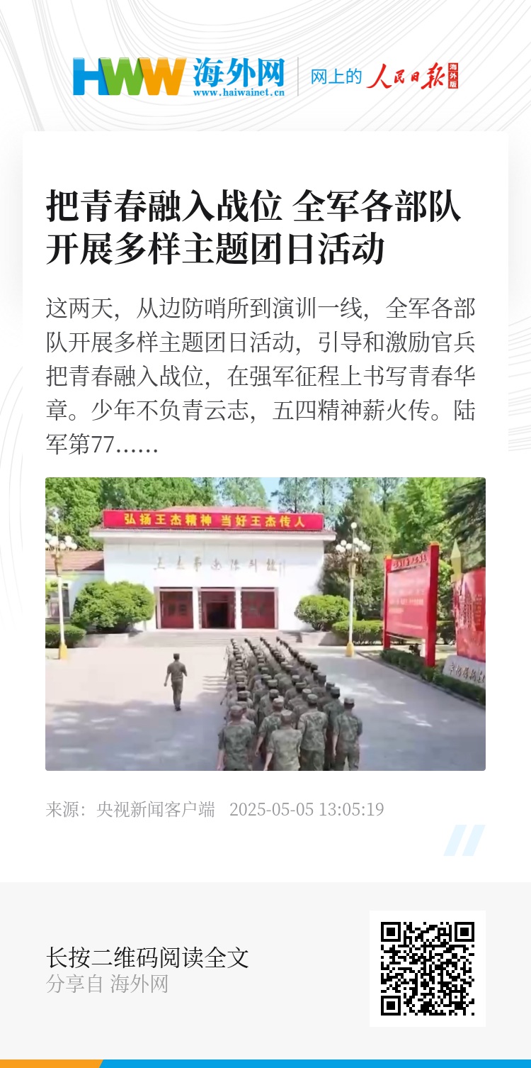 这两天,从边防哨所到演训一线,全军各部队开展多样主题团日活动,引导和激励官兵把青春融入战位,在强军征程上书写青春华章。