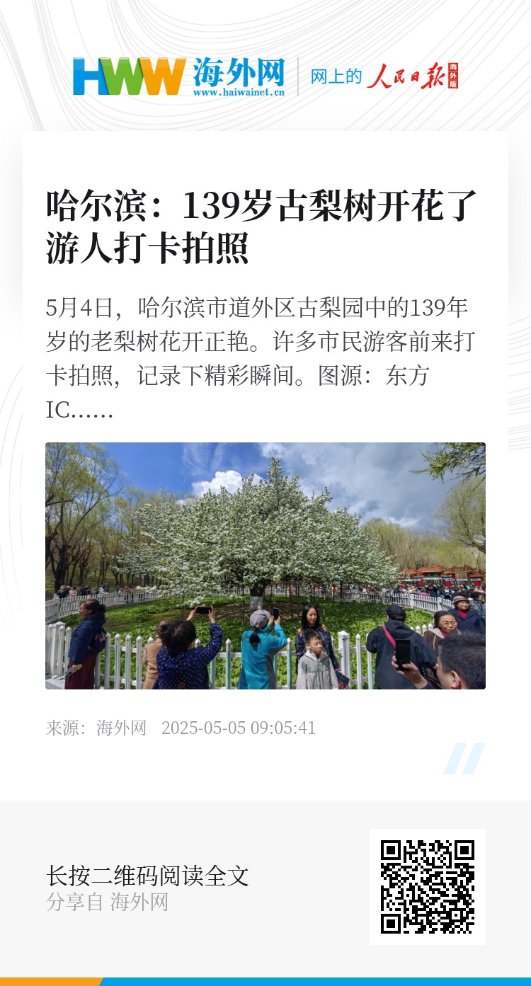 32860279,.哈尔滨:139岁古梨树开花了 游人打卡拍照,.2025-05-05 09:59:41,.204428,.张青津、卢思宇