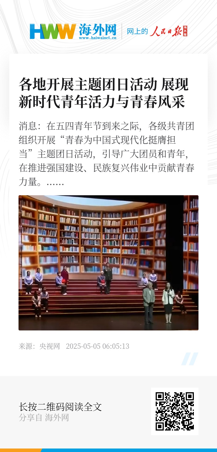 这个“五一”假期,在福建福州,高铁“五四青年主题车厢”开启了特别旅程。各界青年和旅客通过互动问答、快闪等形式,共同唱响新时代青年之声。多地还通过举办青春歌会、情景剧、非遗市集等特色活动,展现新时代青年活力与青春风采。