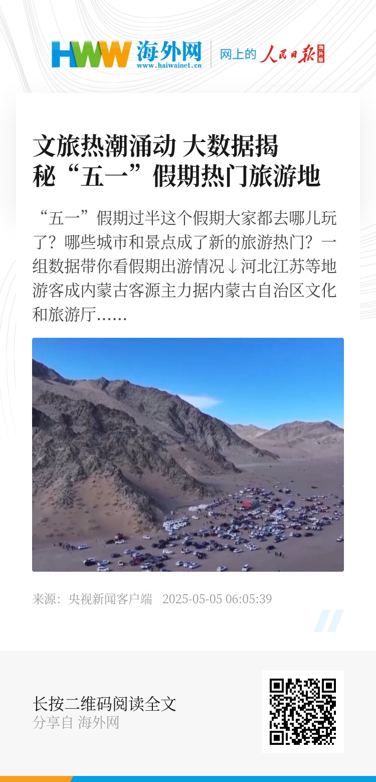 据内蒙古自治区文化和旅游厅统计数据显示,“五一” 假期第三天,内蒙古接待国内游客达343.66万人次,与2024年同期相比增长8.09%;假期前三天累计接待国内游客1033.16万人次,同比增长13.19%。