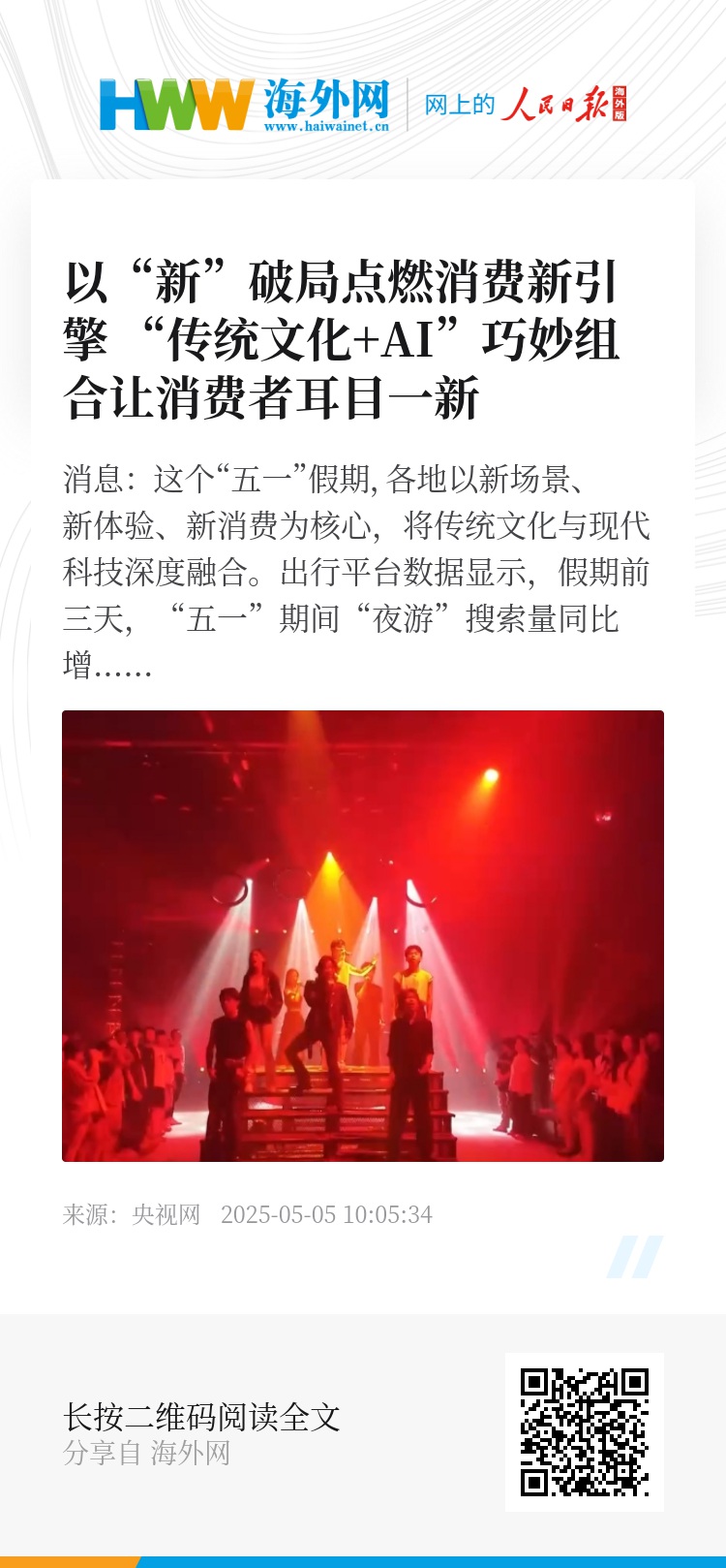 央视网消息: 这个“五一”假期,各地以新场景、新体验、新消费为核心,将传统文化与现代科技深度融合。出行平台数据显示,假期前三天,“五一”期间“夜游”搜索量同比增长超六成。层出不穷的新场景不仅成功“圈粉”八方游客,更以创新业态拉动消费升级。