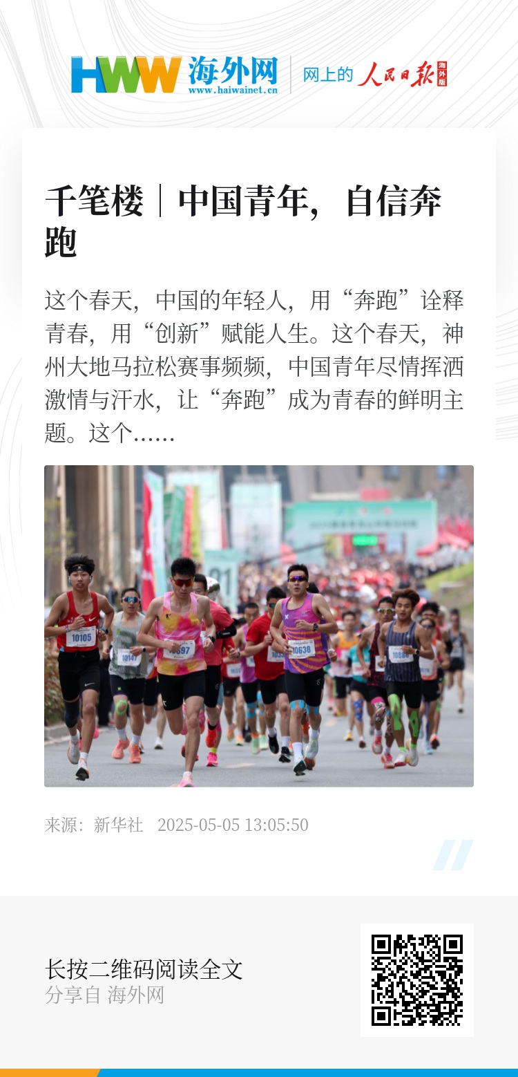 2025年的春天,中国青年的胸膛里,跳动着奔跑的火焰。他们在马拉松赛道上,跑出了青春活力,聚拢了城市烟火人气。他们用自信和力量、动感与朝气,刷出了这个春天里最靓丽、最动人的风景线。