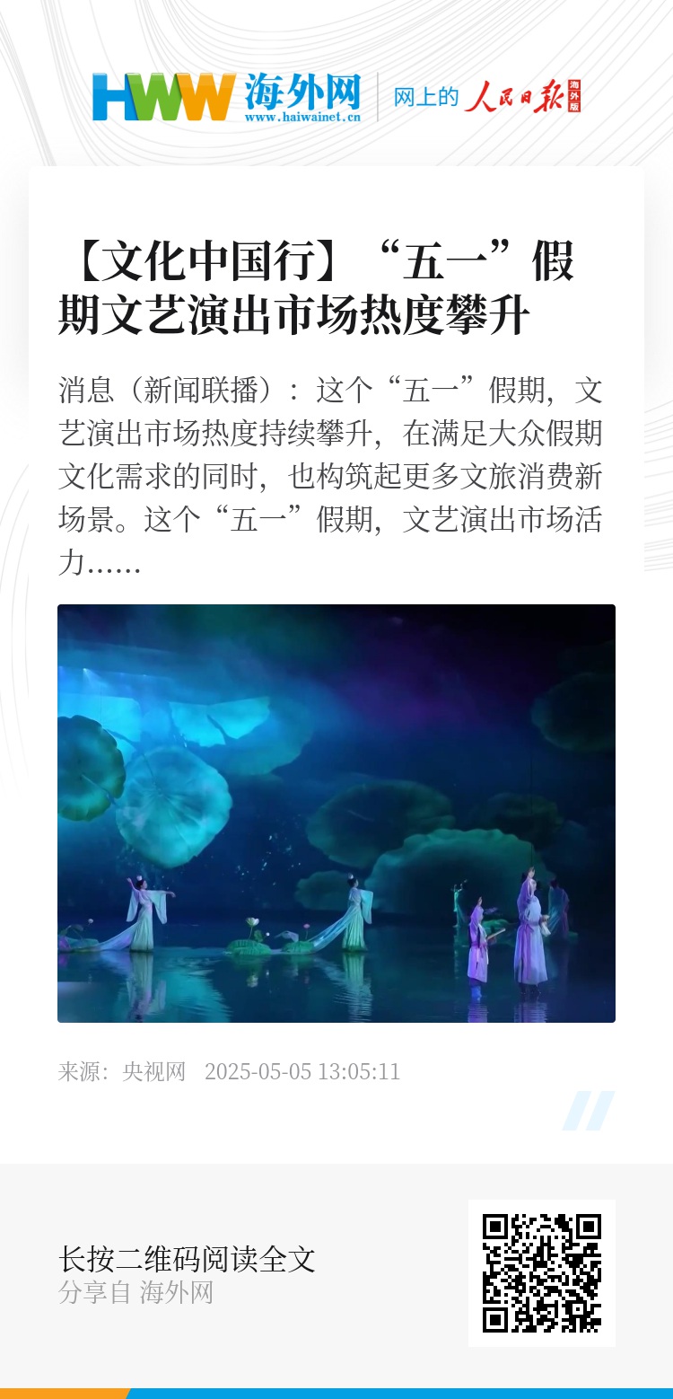 央视网消息(新闻联播):这个“五一”假期,文艺演出市场热度持续攀升,在满足大众假期文化需求的同时,也构筑起更多文旅消费新场景。