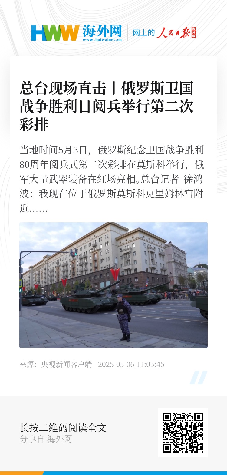 总台记者 徐鸿波:我现在位于俄罗斯莫斯科克里姆林宫附近,现在我的身后正在进行2025年度俄罗斯胜利日阅兵彩排活动。根据我们从现场非官方渠道获得的消息,共计有超过1万名军事人员参加本年度的阅兵。在武器装备方面有“传奇坦克”之称的T-34坦克领衔。根据目前观察到的信息,阅兵仪式上我们可以看到S-400防空导弹系统,“伊斯坎德尔”战术导弹,“亚尔斯”洲际弹道导弹和首次亮相阅兵仪式的“天竺葵-2”无人机。