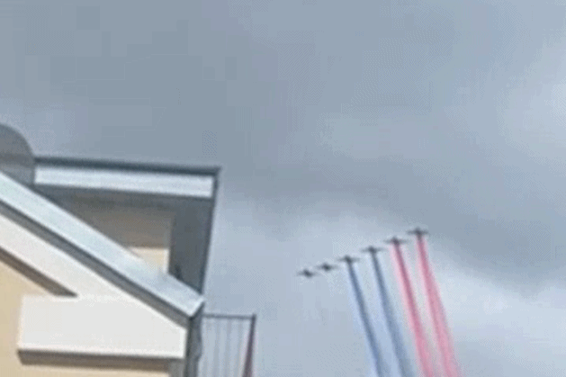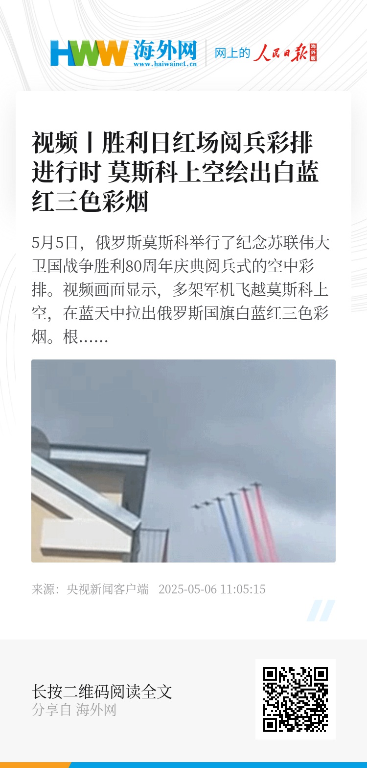 视频画面显示,多架军机飞越莫斯科上空,在蓝天中拉出俄罗斯国旗白蓝红三色彩烟。