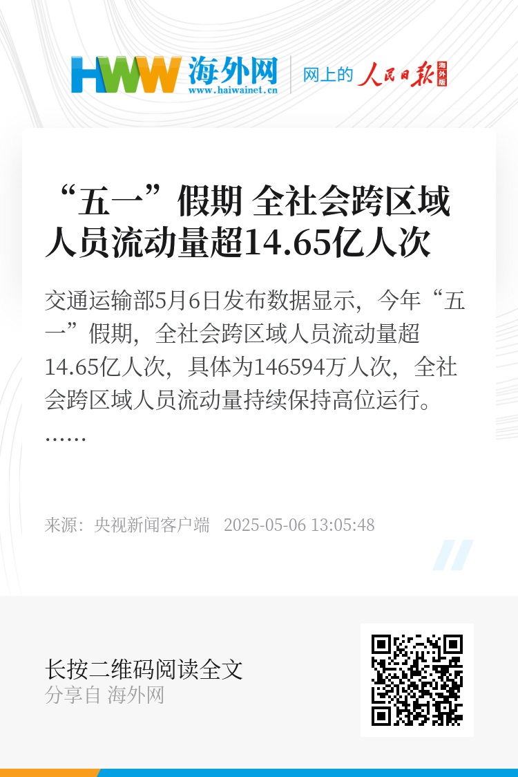 交通运输部5月6日发布数据显示,今年“五一”假期,全社会跨区域人员流动量超14.65亿人次,具体为146594万人次,全社会跨区域人员流动量持续保持高位运行。