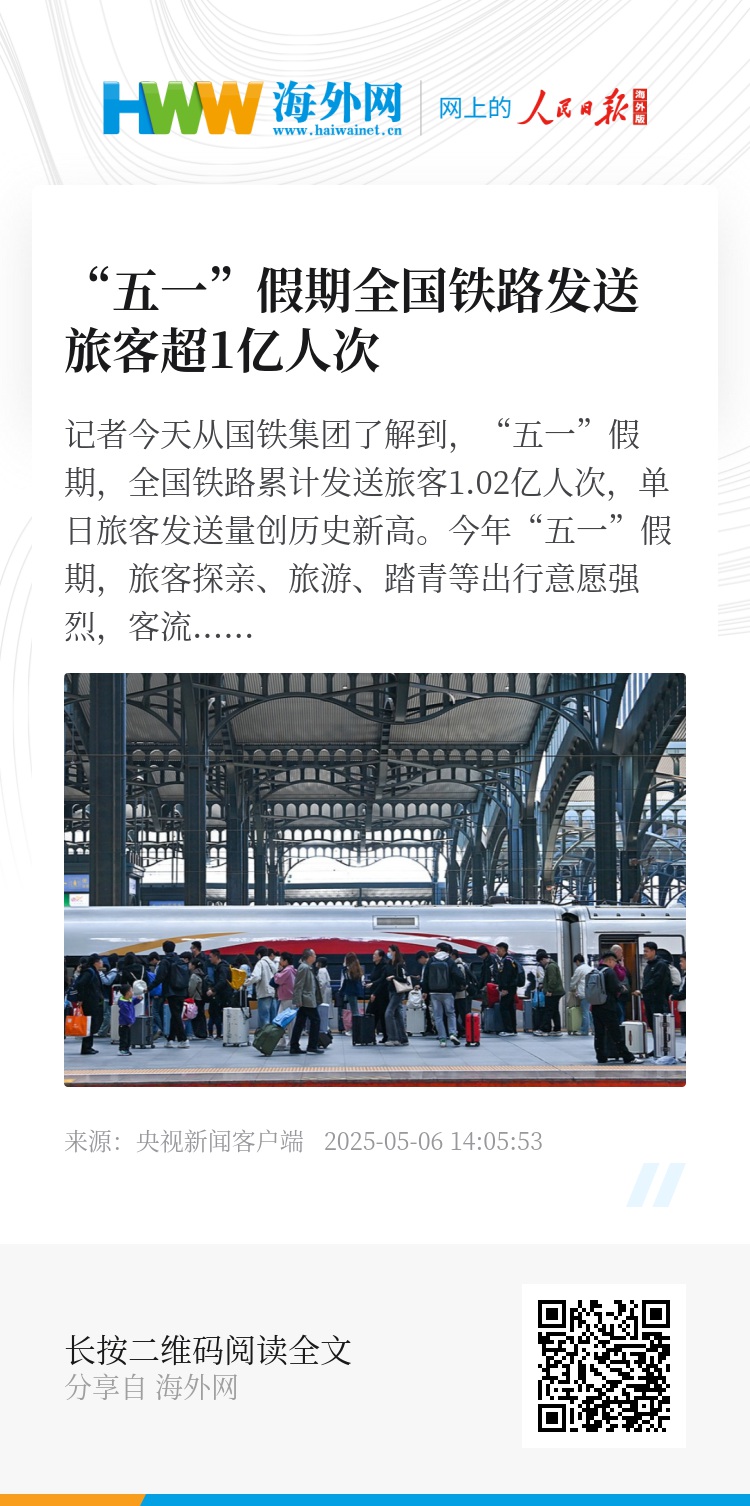 记者今天从国铁集团了解到,“五一”假期,全国铁路累计发送旅客1.02亿人次,单日旅客发送量创历史新高。